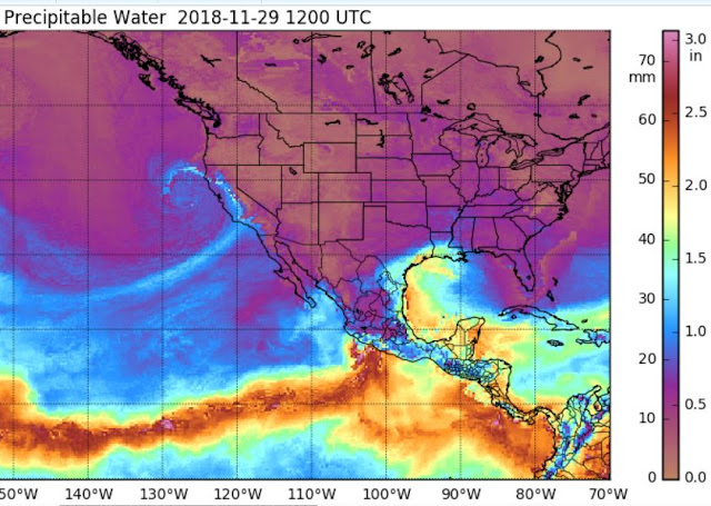 This morning the MIMIC toal PW analysis (above for 12 UTC) shows core of system approacging San Francisco. There is a distinct river of higher PW along the system's front, and light rains are already occurring over LA Basin. Model forecasts for PW at TUS jump it up to about 3/4 inch during frontal passage after midnight tonight.