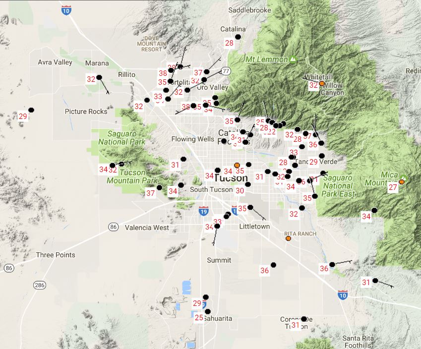 Edited to add observed temperatures at 05:00 and 07:00 am this morning. Just below are current observations from MesoWest for metro area at 07:00 am MST. Down below the 05:00 am forecast are observations from 05:00 am. The model forecasts were reasonably good, but seem to have overdone the warm area on the west side of redington pass. temperature spread at both times a bit less than 15 F. Note that TUS was 34 F at 05:00 am and 30 F at 07:00 am. Here at house we are 23 F, with moderate frost and some ice on my three Max/Min thermometers, which is not good.