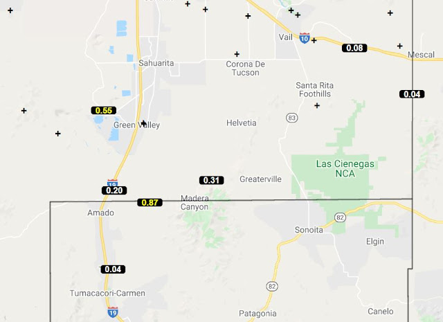 Across the ALERT network only 12 sites measured 0.04" or more (above and below for 24 hours ending at 6:00 am this morning). Three sites did have over half an inch - the site in the Catalinas may have been within the Bighorn fire burn scar, which would have made for nasty runoff.