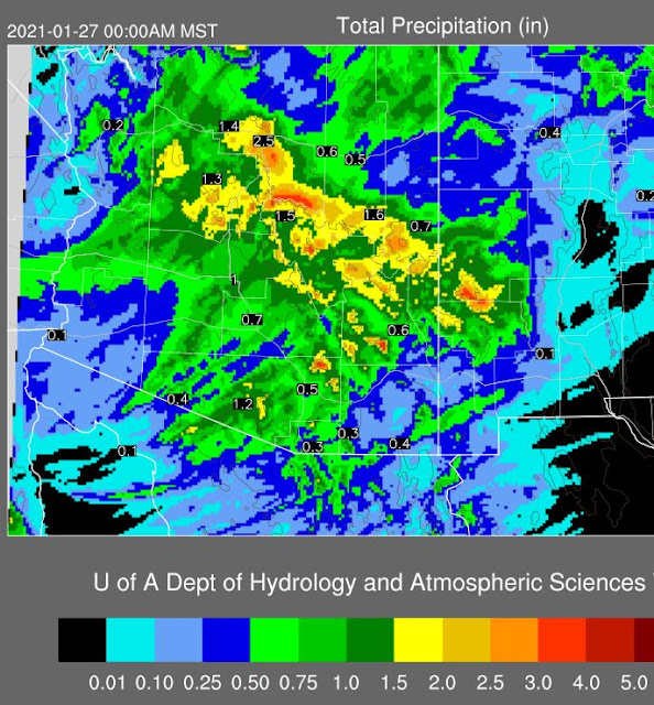 Models (GEFS above, and 00 UTC WRF-GFS below) again forecast a significant precipitation event for Arizona, although amounts were biased considerably too high by last event's forecasts. We'll wait and see how the situation evolves, beginning Sunday. Wouldn't take much to beat the meager 0.05" here so far in January.