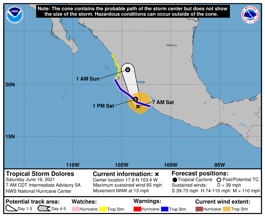 The massive 500 mb anticyclone over the Southwest remains extensive, but is slowly weakening. The heat is expected to continue through the weekend. Map below shows areas currently under heat-related warnings and advisories. Not great grilling weather here in Tucson for Father's Day weekend.