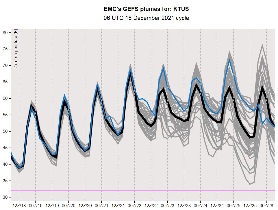 Shown here are three graphics from the 06 UTC forecast run of the WRF-GFS at Atmo. Above shows forecast for strong wind speeds over southeastern Arizona at 3:00 pm tomorrow afternoon. Forecast below is for total precipitation through noon on Saturday - 1 January 2022. Second below is WRF forecast for snow amounts through 5:00 pm on New Years Day - models keep snow mostly on the mountains.