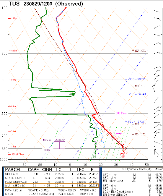 The morning sounding for TWC/TUS (above) continues unimpressive, with light winds aloft and just a sliver of CAPE.